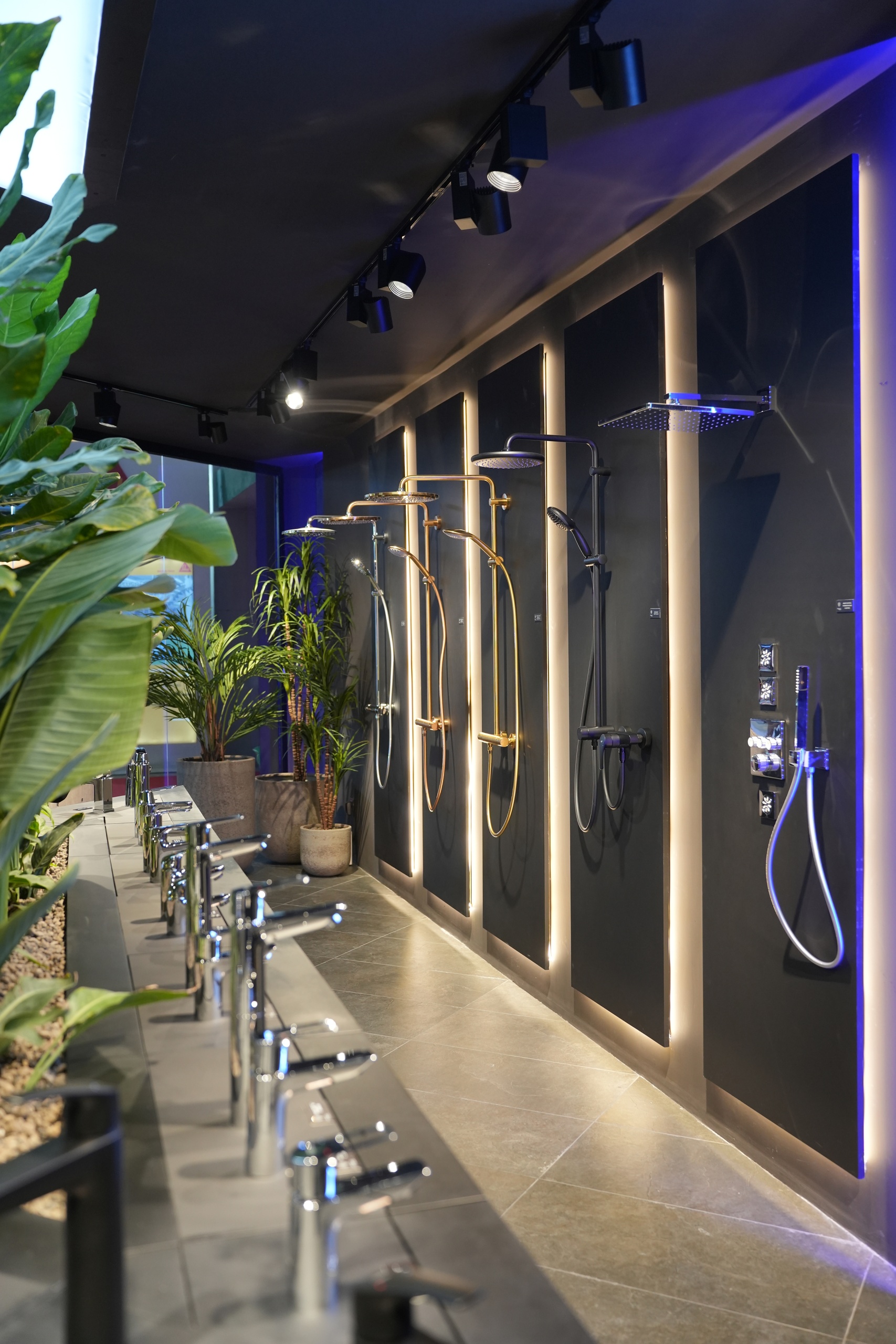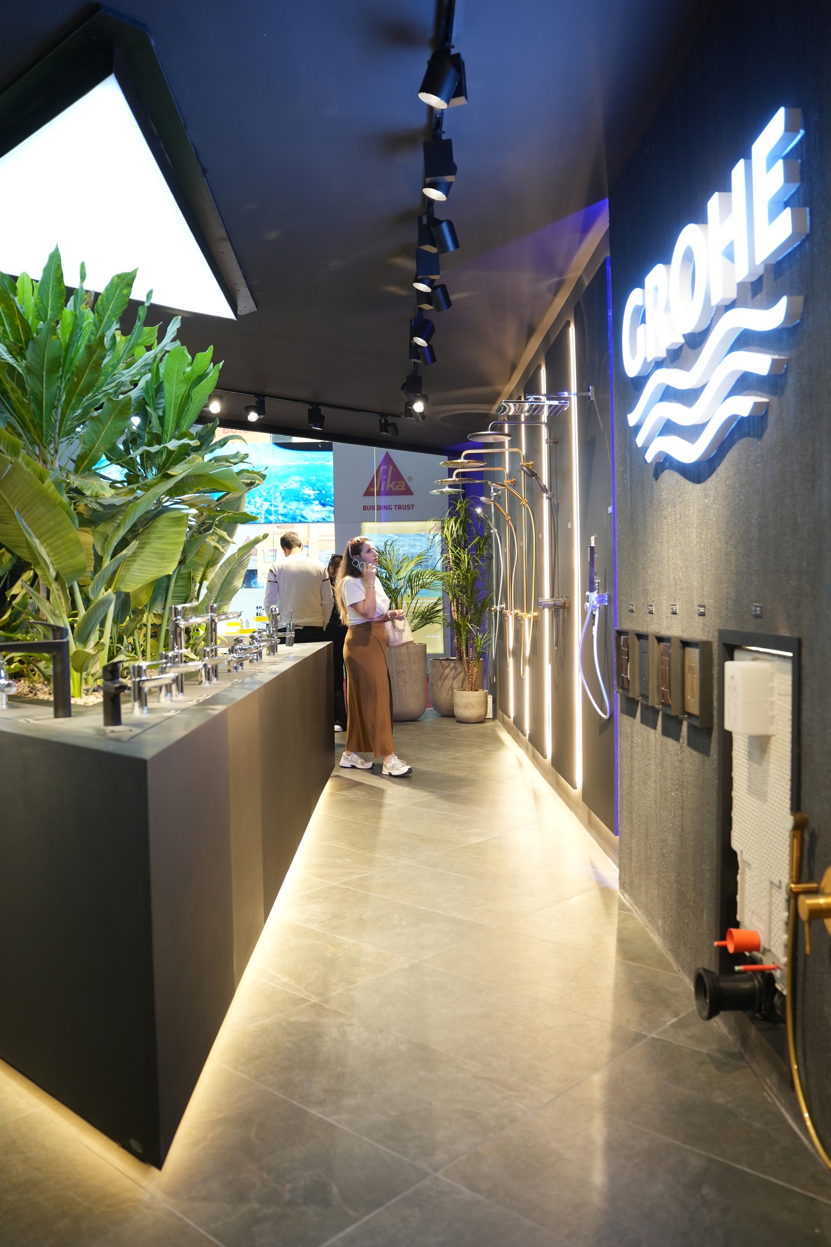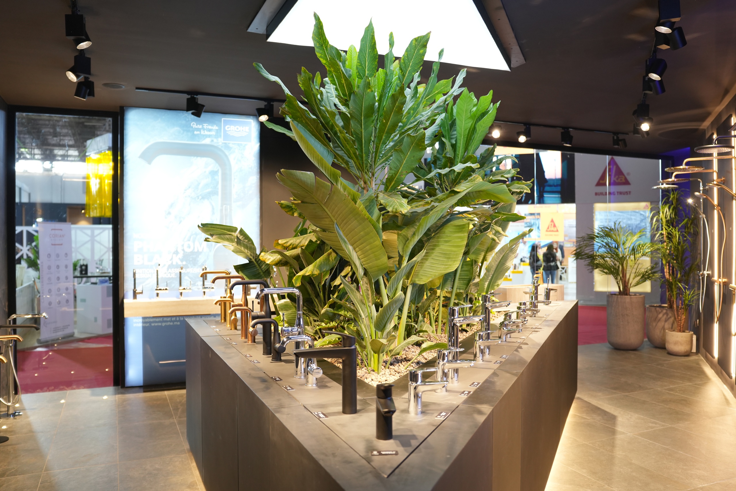 Le stand se distingue par sa manière innovante d’exposer les produits. Les éléments de revêtements, par exemple, sont présentés tantôt encadrés comme des œuvres d’art, tantôt sous forme de sculptures modernes, apportant une dimension esthétique unique. La robinetterie, quant à elle, est mise en scène et sublimée par un grand bac de strelitzias, qui lui confère un aspect artistique.